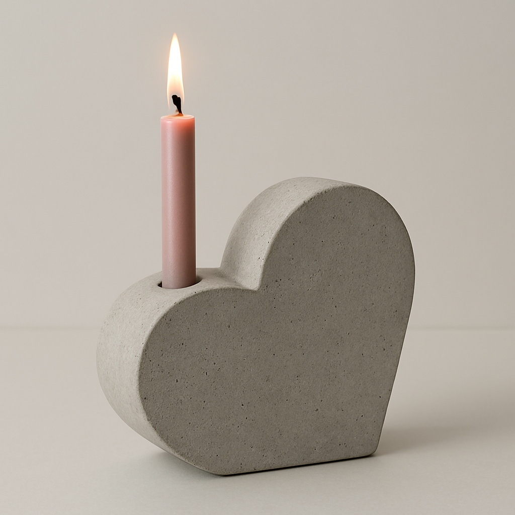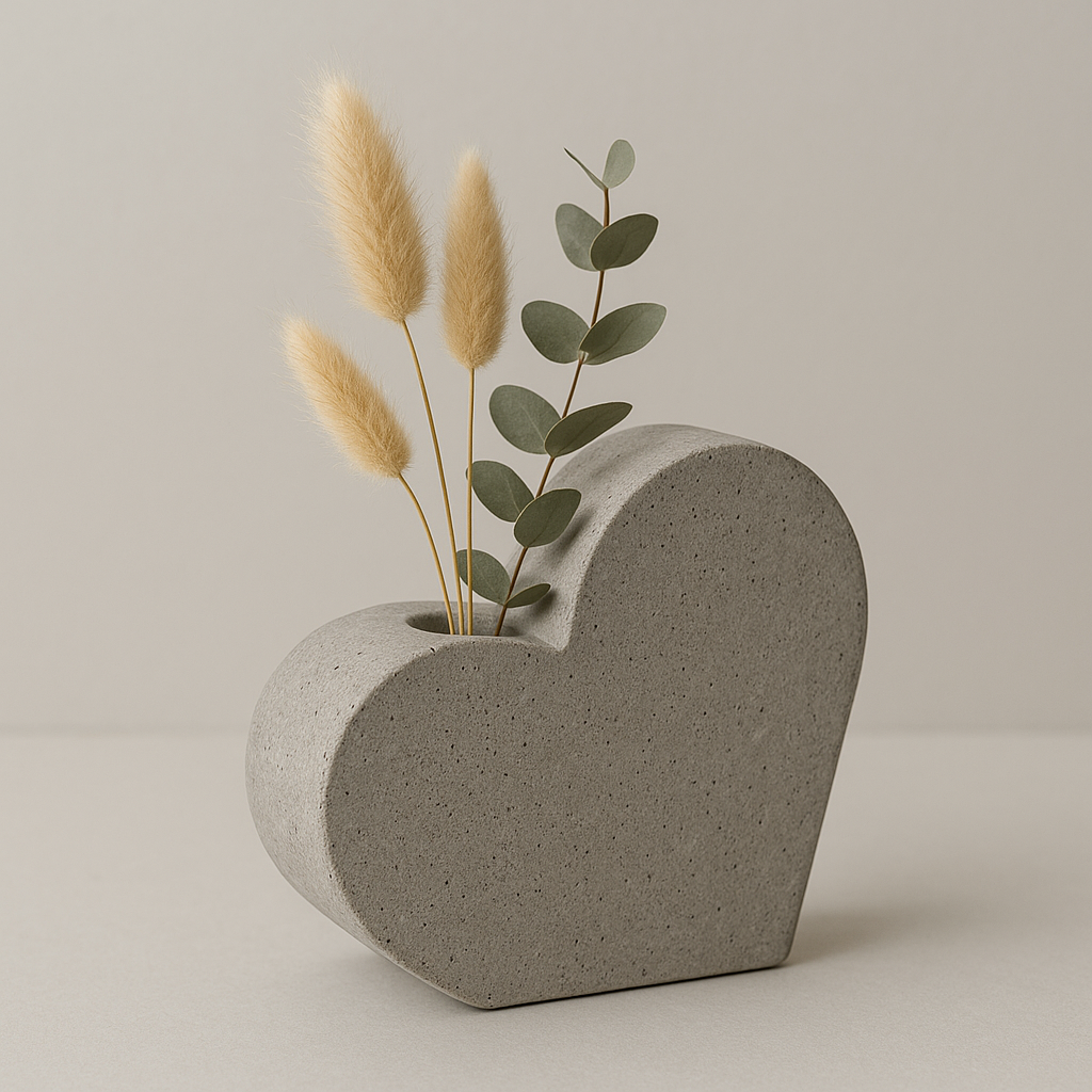 Minimalistisch, schwer und doch romantisch: Diese Herzvase wird in kleiner Auflage von Hand aus Feinbeton gegossen. Die weiche Silhouette und die fein porige Oberfläche machen sie zum ruhigen Statement-Piece auf Sideboard, Fensterbank oder Nachttisch.