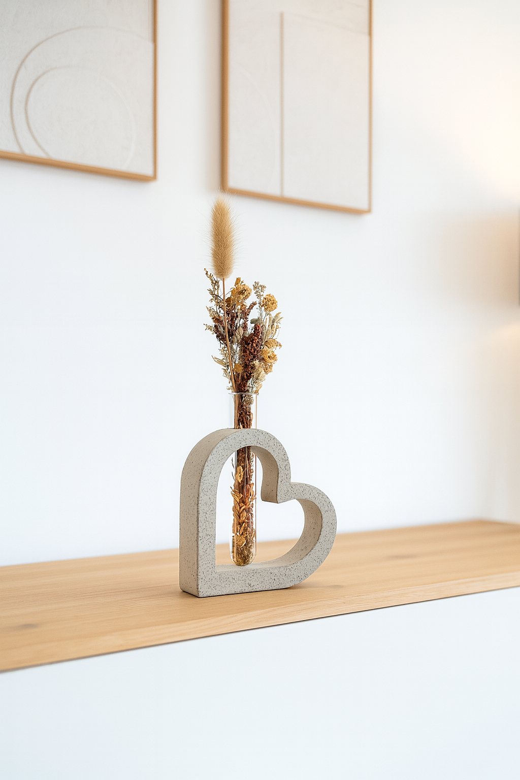In der integrierten Glasröhre kannst du getrocknete Blumen, Gräser oder kleine Zweige stilvoll arrangieren. So wird das Betonherz zu einem echten Blickfang – ganz gleich, ob einzeln aufgestellt oder in Kombination mit weiteren Wohnaccessoires.