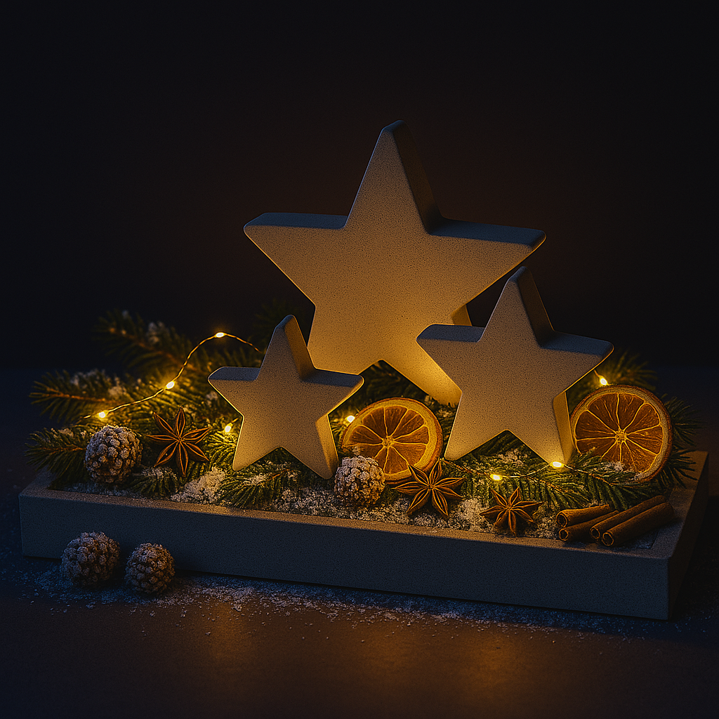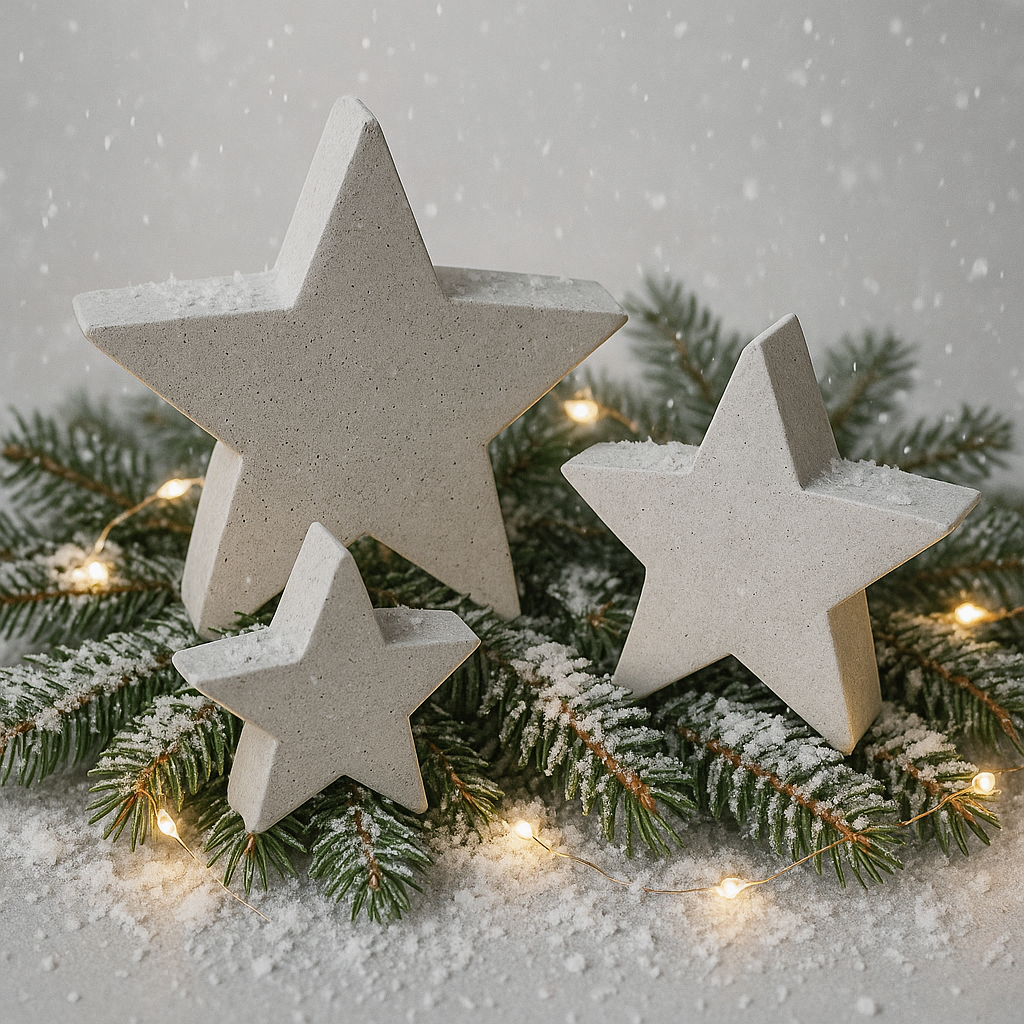Schlicht & winterlich: Handgegossene Sterne aus Beton oder Gips – minimalistisch, matt und standfest. Perfekt für Tisch, Tablett, Fensterbank, Regal oder zwischen Tannengrün.